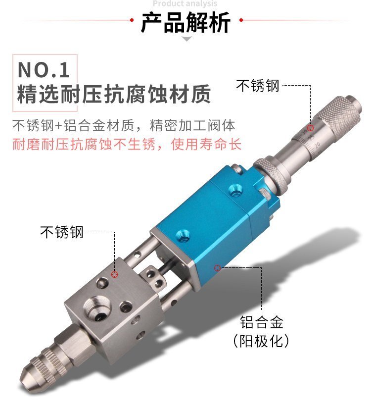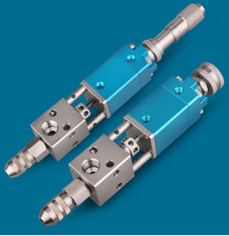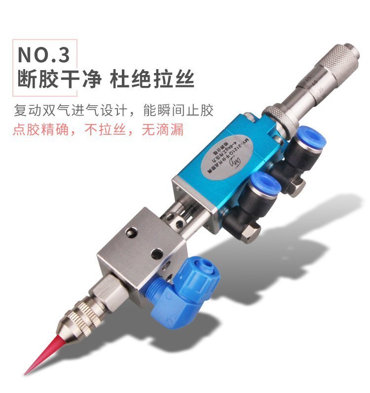 MY-2121精密頂針式單液閥,雙向驅動,可調行程,出咀針頭可用針頭帽固定或直 接旋取;適用流動性好,低粘度性水狀流體,如UV膠、墨水、酒精等;可與各種供料泵或儲料壓力桶使用,可接各式點膠針頭,可與全自動點膠機裝配數個點膠閥同時點膠作業;采用鋁合金陽極化+不銹鋼優質材料制造,不生銹防腐蝕,適合工程/工廠長期生產使用;有大量現貨供應,歡迎咨詢采購!