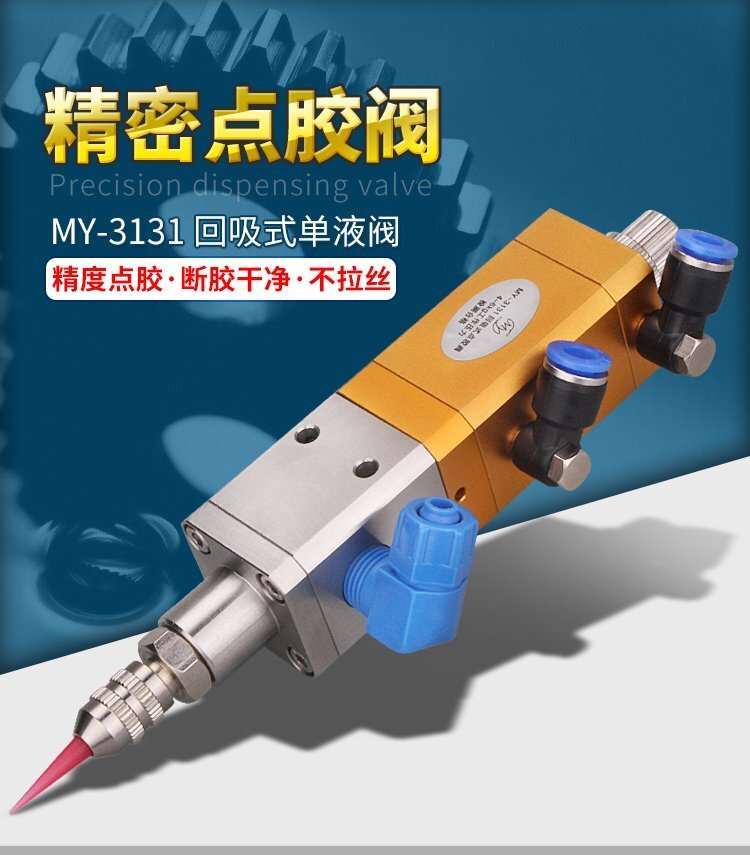 MY-3131可調回吸式點膠閥,適合流動性差,中高粘度性膠水,如:油脂、硅膠、 環氧樹脂、黃膠、錫膏等;回吸式點膠閥采用向上運動關膠結構,使停膠同時瞬間回吸斷膠,減少余留針頭上的殘膠,使點膠不產生漏滴、拉絲等現象,可接各式點膠針頭;采用鋁合金陽極化+不銹鋼優質材料制造,不生銹防腐蝕,適合工程/工廠長期生產使用;有大量現貨供應,歡迎咨詢采購!