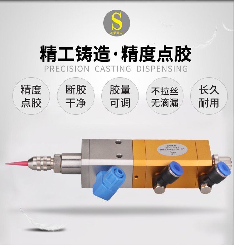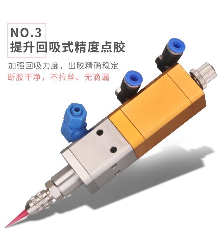 氣動:點膠閥由氣缸、閥體和料缸三部分上下連接而成,氣缸和閥體用先進密封材料隔開,避免膠水侵入氣缸。料缸和氣缸連接在點膠閥閥主體上,與氣缸保證同心度。用電磁閥氣動氣缸運動,從而驅動中心桿上下運動,利用中心桿的上下運動達到對膠水的開啟和關斷作用。根據開啟和關斷的方式不同,從而分為:柱塞式點膠閥、頂針式點膠閥、提升式點膠閥、噴霧點膠閥、噴射點膠閥;開關方式不同,適用的流體也就不同,回吸式點膠閥采用向上運動關膠結構,使停膠同時瞬間回吸斷膠,減少余留針頭上的殘膠,使點膠不產生漏滴、拉絲等現象。膠閥本體經鋁合金陽極氧化處理,密封材料采用最新四氟材料,接觸膠體部分均為耐腐蝕材料。