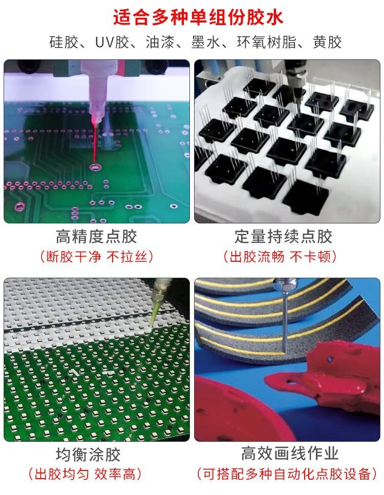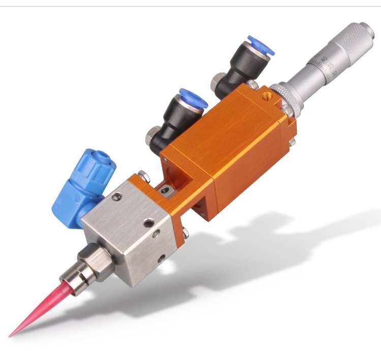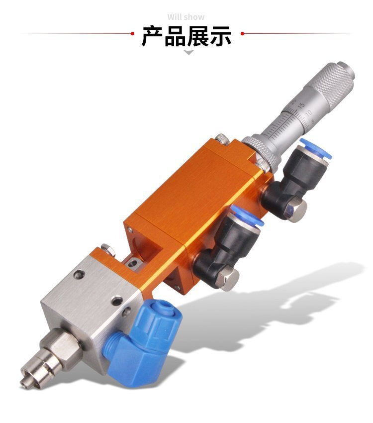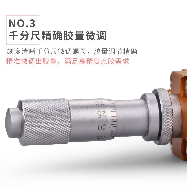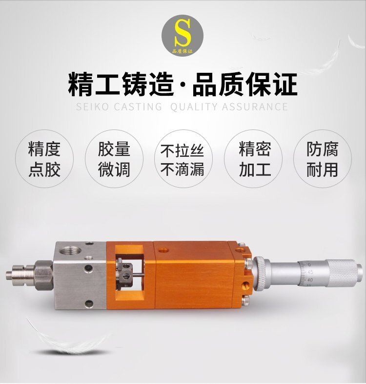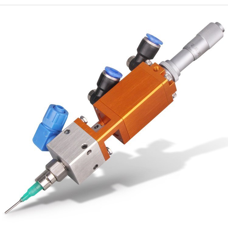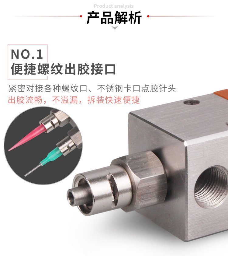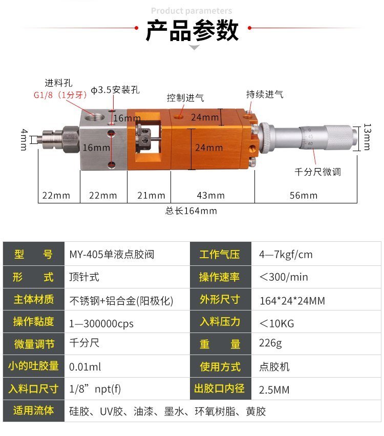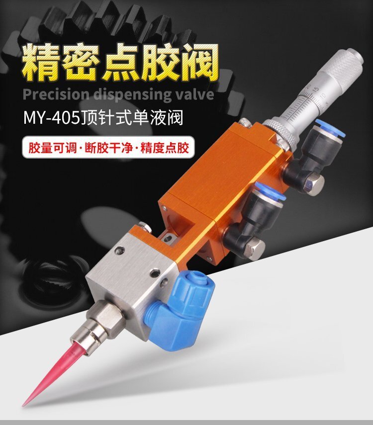 MY-405千分尺微調(diào)頂針式式點膠閥,適合中低粘度性膠水,如:UV膠、硅膠、黃 膠、墨水、油漆等;反應(yīng)快,不拉絲、不漏膠,可作點膠畫線涂膠等工業(yè)使用; 可與各種供料泵或儲料壓力桶使用,可接各式點膠針頭,可與全自動點膠機裝配數(shù)個點膠閥同時點膠作業(yè);采用鋁合金陽極化+不銹鋼優(yōu)質(zhì)材料制造,不生銹防腐蝕,適合工程/工廠長期生產(chǎn)使用;有大量現(xiàn)貨供應(yīng),歡迎咨詢采購!