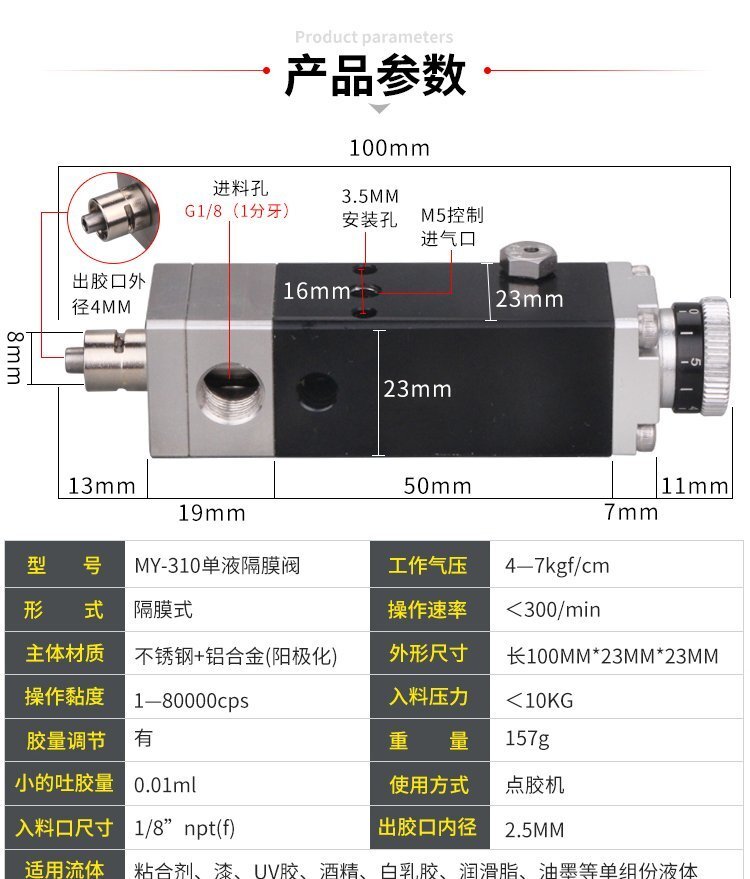 精密點膠閥MY310隔膜式單液閥單組份膠水點膠機隔膜閥氣動帶微調(diào)