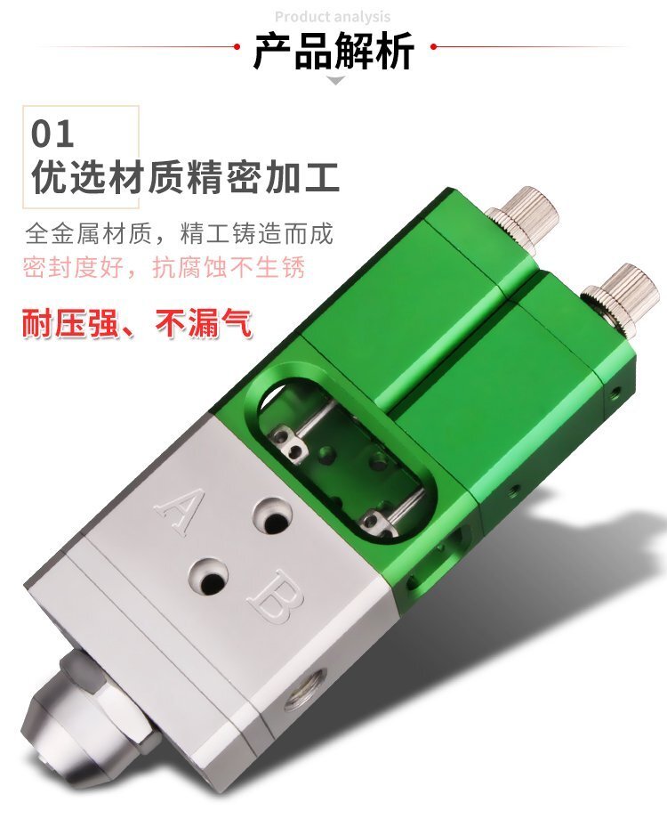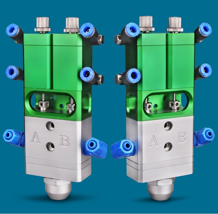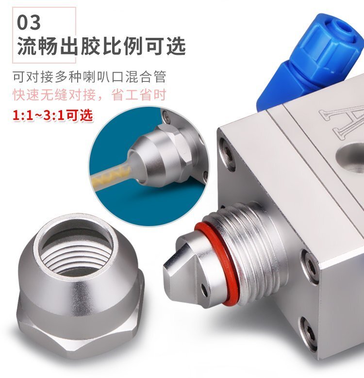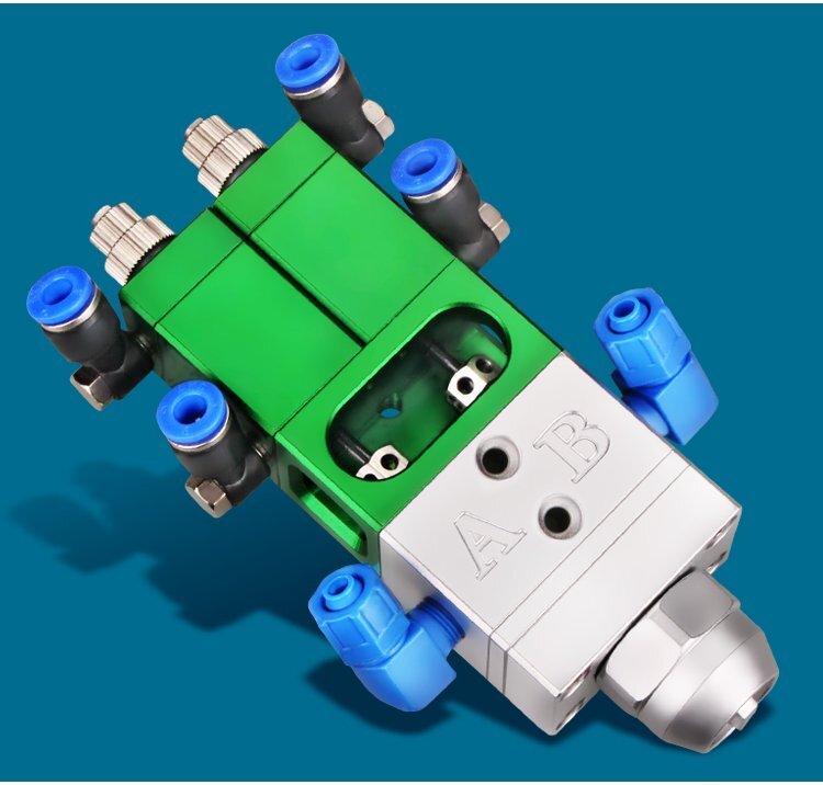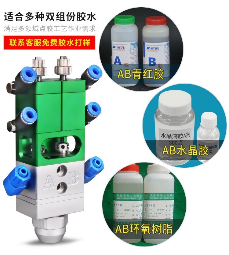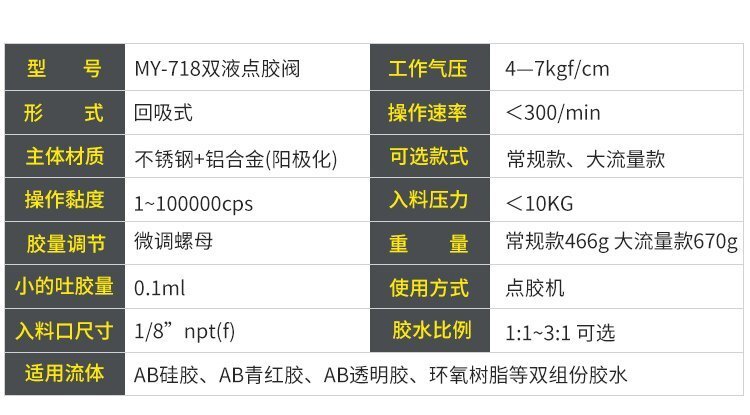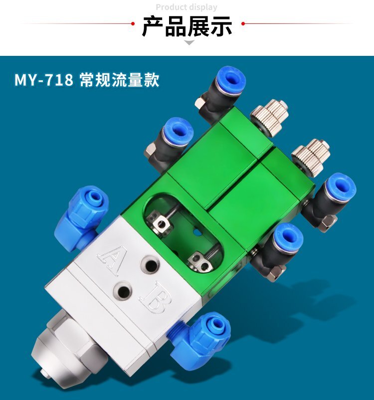MY-718精密AB雙液點膠閥,比例1:1-3:1可選,出膠量可獨立微調,有圓口和卡口可選;適用流動性好,中低粘度性水狀流體,如青紅膠、封灌黑膠、AB環氧樹脂膠、水晶膠等雙組份膠水;可與各種供料泵或儲料壓力桶使用,可接各式點膠針頭,可與全自動點膠機裝配數個點膠閥同時點膠作業;采用鋁合金陽極化+不銹鋼優質材料制造,不生銹防腐蝕,適合工程/工廠長期生產使用;有大量現貨供應,歡迎咨詢采購!