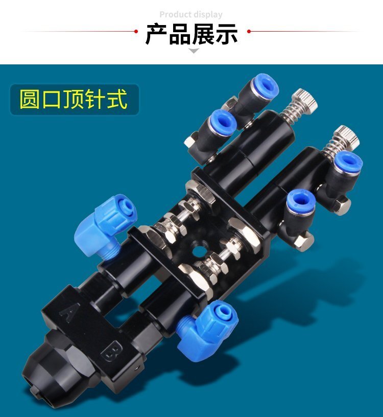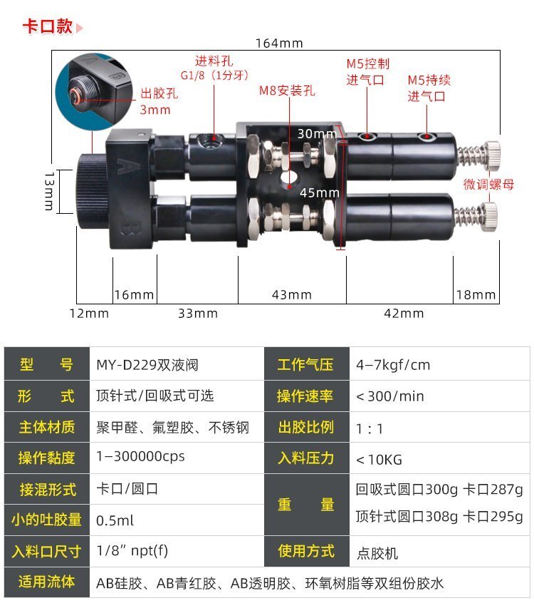 MY-D299AB雙液閥,有【頂針式卡口/回吸式卡口/回吸式圓口】三款可選,適合中低粘度性的AB雙組份膠水,如:封灌黑膠、AB硅膠、AB青紅膠、AB水晶膠、環氧樹脂膠;出膠量可以微調,膠水比例1:1精確出膠,具有回吸功能,避免拉絲現象,可接各式點膠針頭;采用聚甲醛+氟塑膠+不銹鋼優質材料制造,不生銹防腐蝕,適合工程/工廠長期生產使用;有大量現貨供應,歡迎咨詢采購!