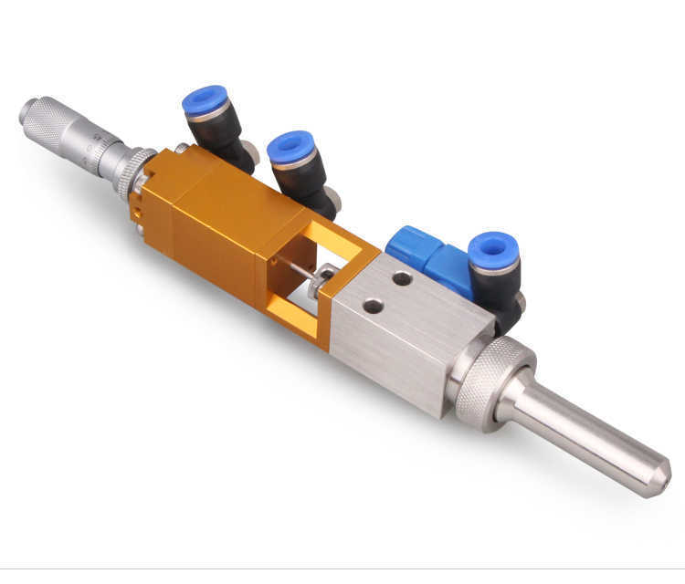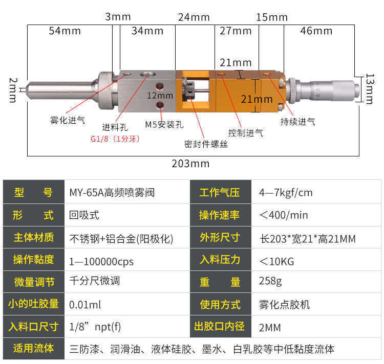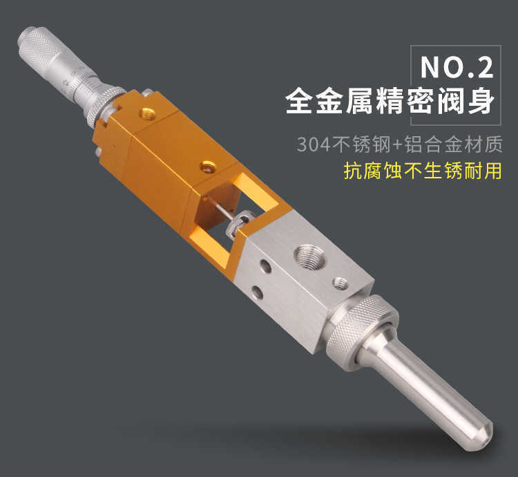 回吸式點膠閥采用向上運動關(guān)膠結(jié)構(gòu),使停膠同時瞬間回吸斷膠,減少余留針頭上的殘膠,使點膠不產(chǎn)生漏滴、拉絲等現(xiàn)象。膠閥本體經(jīng)鋁合金陽極氧化處理,密封材料采用最新四氟材料,接觸膠體部分均為耐腐蝕材料。