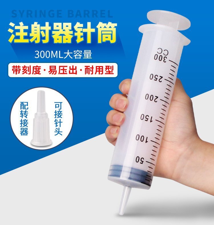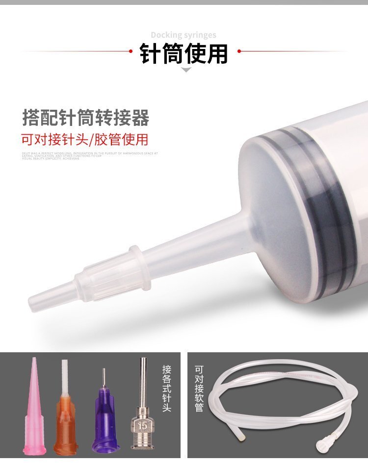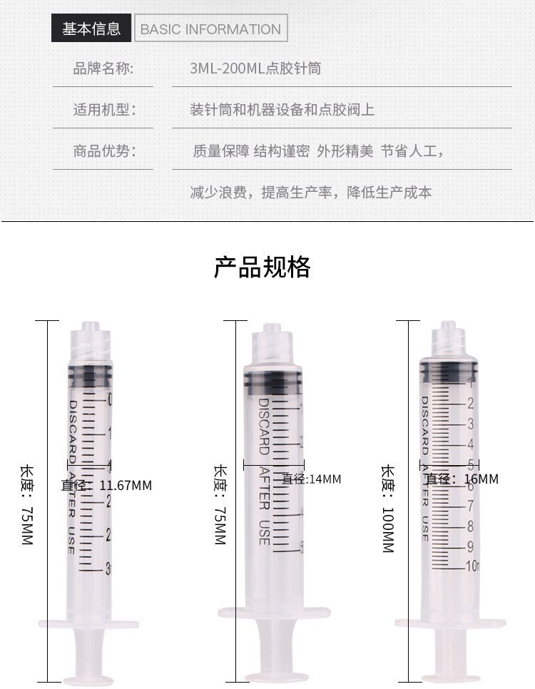 注射器塑料針筒,有螺口和大口兩種出膠口型可選,規格:3ML、5ML、10ML、20ML、50ML、60ML、3ML、100ML、150ML、200ML、250ML、300ML;采用環保型PP材料制造,耐磨耐用,不易破裂,適合工程/工廠長期生產使用;有大量現貨供應,歡迎咨詢采購!