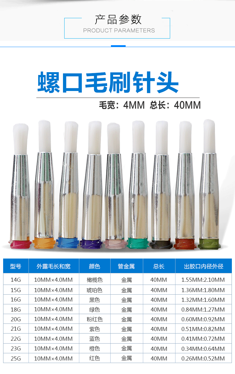毛刷針頭主要針對不同面積涂膠的產品工藝,具有涂膠均勻、不堆膠、不斷膠,適合大面積表面刷圖膠液;毛刷為尼龍材質,韌性佳,不斷毛,不 掉毛,軟毛接觸產品,安全可靠,極大的提高生產效率!