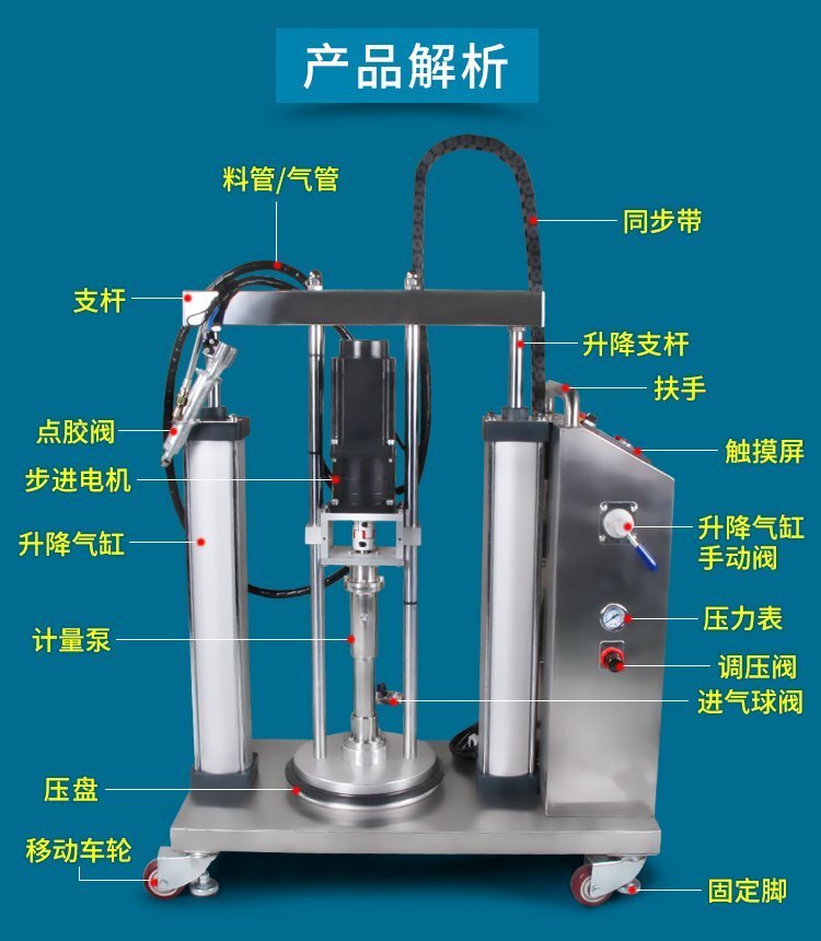 MY-6100高粘度壓盤點膠機,是由本公司自主研發設計,精密加工制造的一款高粘度硅膠壓盤泵單液點膠機,采用步進機驅動,齒輪泵/螺桿泵送料,使膠水能夠連續穩定輸出,精度高;主要用在電子行業、LED行業、工藝品行業等廣泛應用;具有高壓強出膠,升降大氣缸,出膠快速,持續穩定,高粘度膠水輕松壓出、快速調試設置出膠量、精度點膠、定時定 量出膠、智能檢測機器故障報警等功能;適合多種單組份膠水,如:高稠度硅膠、油脂類黏膠、玻璃膠、聚硫膠、潤滑脂、亞克力膠、油漆、固體膠、橡膠、亮漆、瞬間膠等工業膠水;出膠頭配置精密單液閥