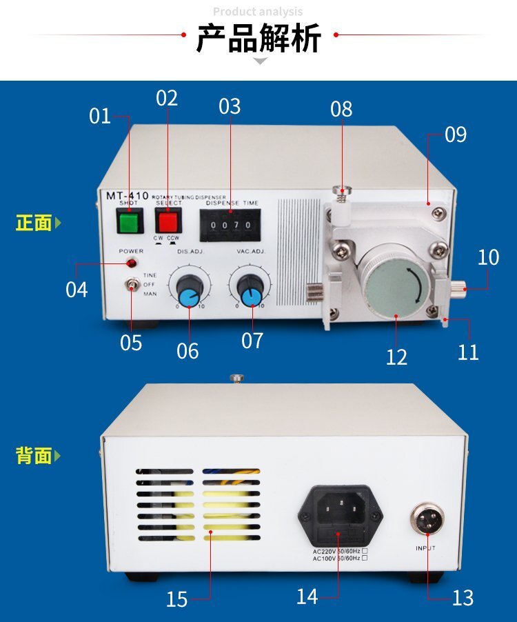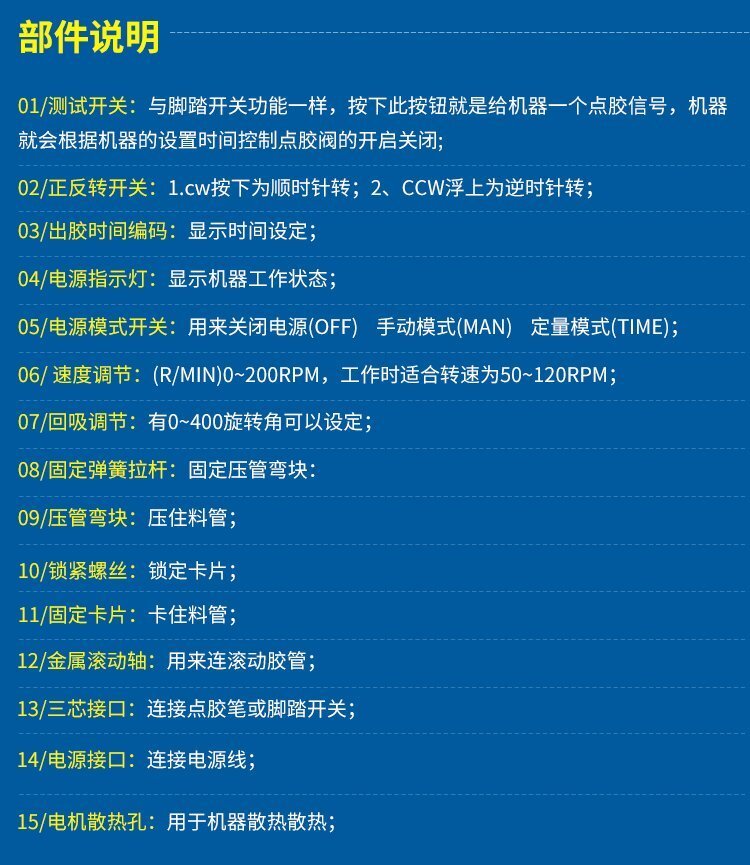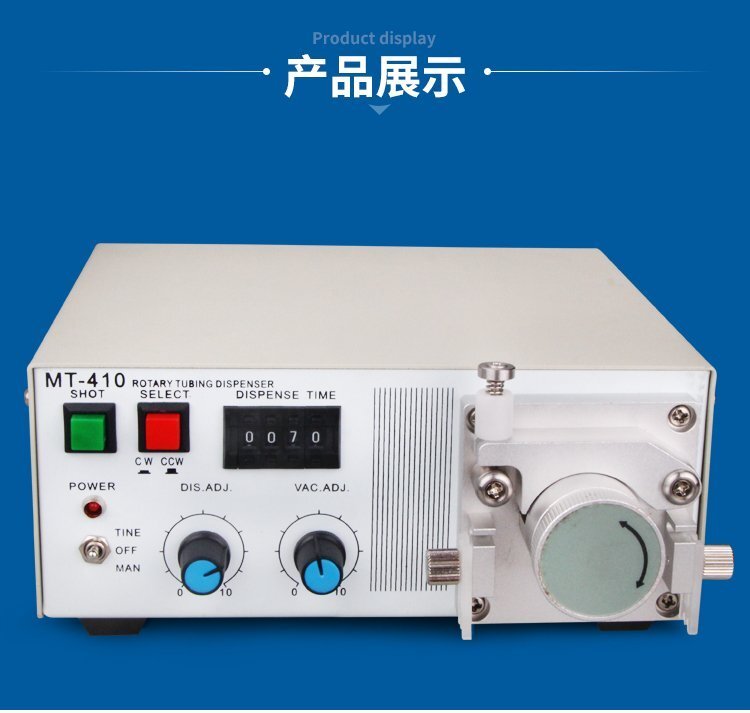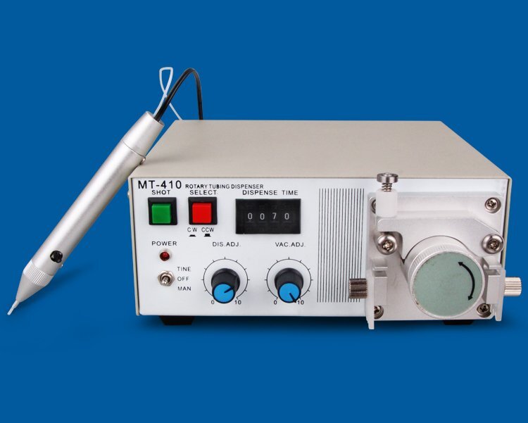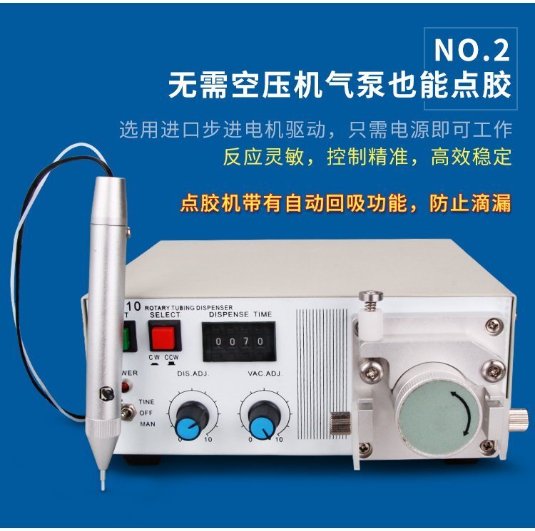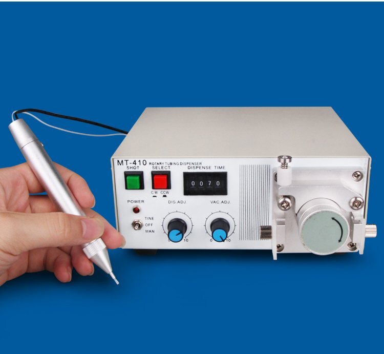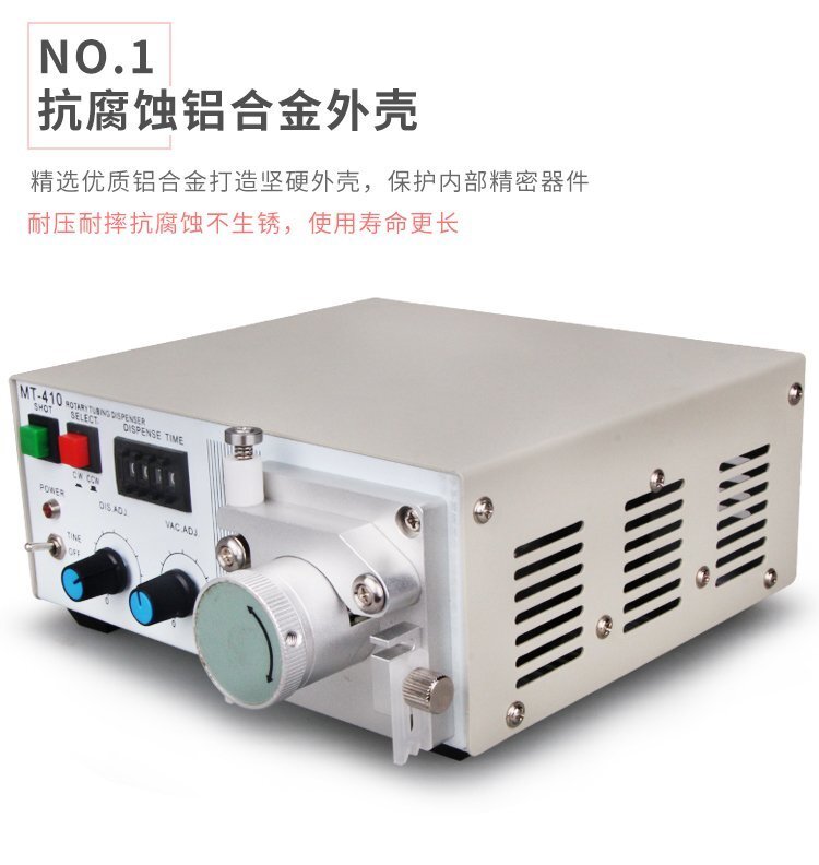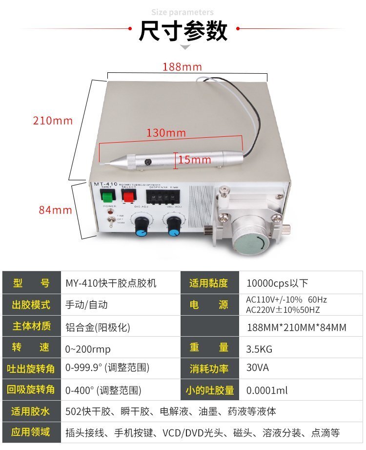 MY—410快干點膠機,內置高精密電位器,可調節點膠時間,配有防止漏膠的真空機,適合厭氧性、瞬間膠、快干型膠等低粘度液體的微量吐出設備。使用完畢后不需要進行清理調節。 轉子部分可以進行安裝與拆卸,提高了維護性能。管狀旋轉出膠控制結構;數字式時間控制器;點膠筆頭設微動點觸開關,方便操作;瞬間膠點膠機不需要空氣壓,只需電源即可工作;材料可直接使用原裝容器;可快速使交換出膠管,無需整理;瞬間膠點膠機帶有自動回吸功能,防止滴漏;構;備有手動(MAN)/定量(TIME)兩種模式的點膠功能,具有從0.05Mpa的低壓