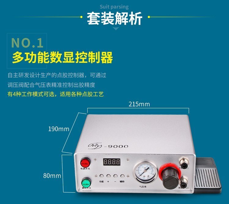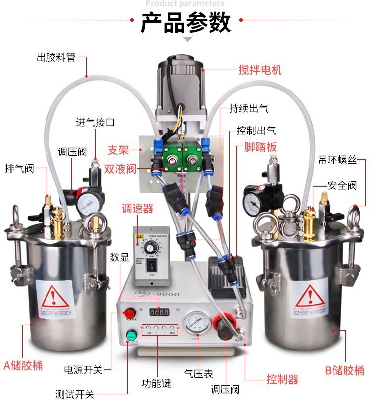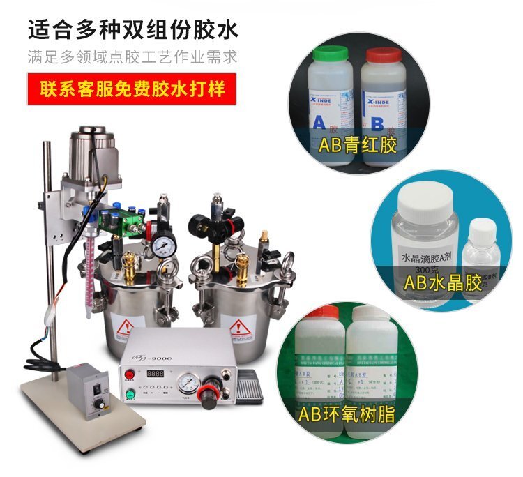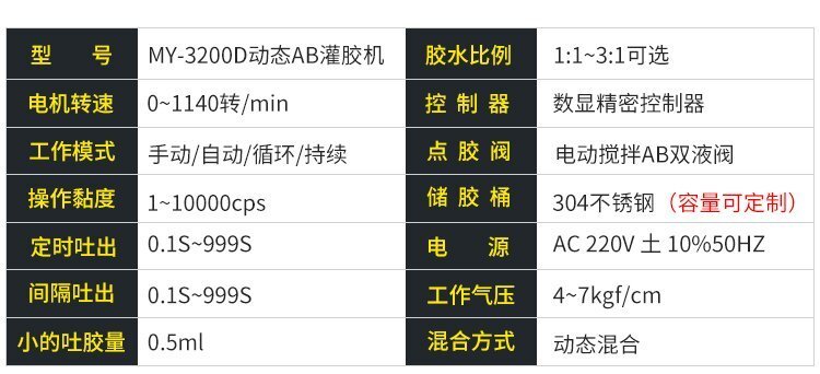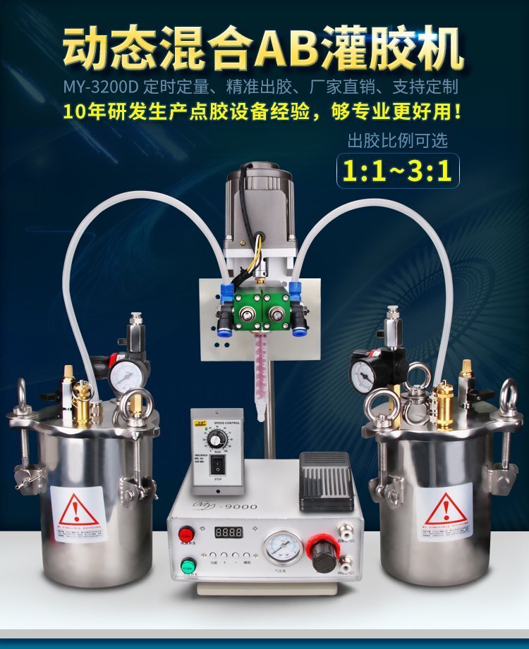 MY-3200D動(dòng)態(tài)攪拌雙液灌膠機(jī)是由“精密數(shù)顯點(diǎn)膠機(jī)+壓力桶+電動(dòng)攪拌雙液閥+調(diào)速器+支架”組合而成的AB雙液灌膠套裝,點(diǎn)膠機(jī)功能模式多,操作簡(jiǎn)易,穩(wěn)定高效;電動(dòng)攪拌雙液閥有帶復(fù)動(dòng)式回吸功能,斷膠干凈,不拉絲,不滴漏,攪拌機(jī)帶動(dòng)混合管高速運(yùn)轉(zhuǎn),使AB膠水混合更均勻,不易固化;調(diào)速控制器,可根據(jù)AB兩種膠水的粘稠度,合理有效的控制攪拌電機(jī)的運(yùn)轉(zhuǎn)速度;套裝具有控制穩(wěn)定、灌膠/點(diǎn)膠精確、應(yīng)用領(lǐng)域廣泛、套裝組件可靈活更換、使用壽命長(zhǎng)、節(jié)省成本等優(yōu)勢(shì),適合工程/工廠長(zhǎng)期生產(chǎn)使用;有大量現(xiàn)貨供應(yīng),歡迎咨詢采購!