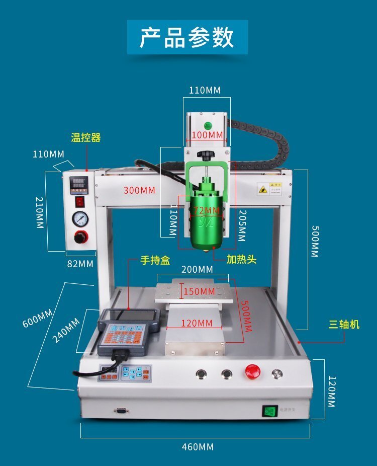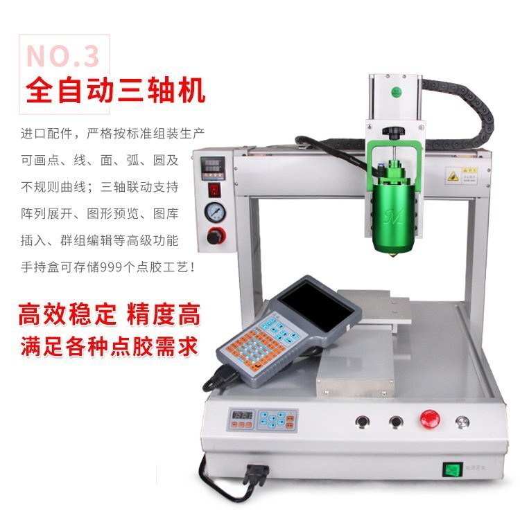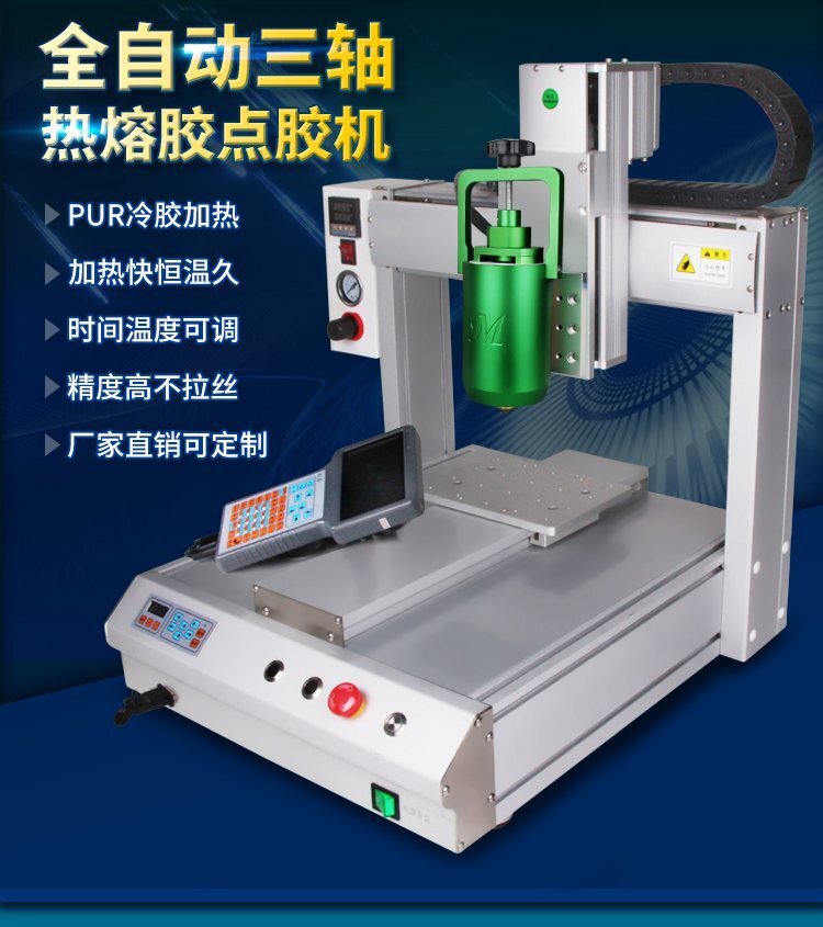 MY-8036是由“331三軸機+9600溫控器+511PUR點膠閥”組合而成的全自動熱熔膠 點膠套裝;三軸機具有畫點、線、面、弧、圓及不規(guī)則曲線連續(xù)補間,可存儲999個點膠工藝文 檔;溫控器加熱范圍在0~200℃,具有控制穩(wěn)定、精準、實用、操作方便等特點;點膠閥加熱速 度快,持久恒溫,耐腐蝕,拆裝簡單便捷等特點;全自動點膠,省工省時,提高生產(chǎn)效率。