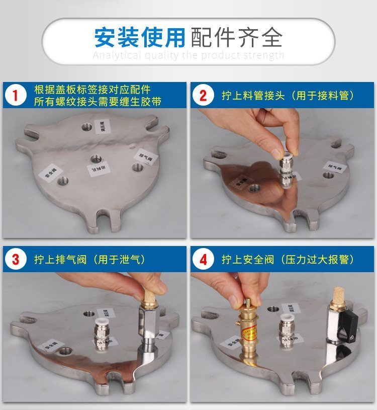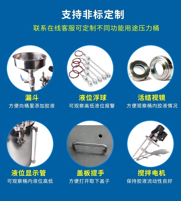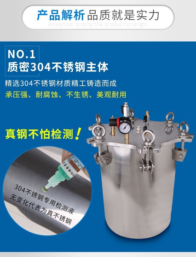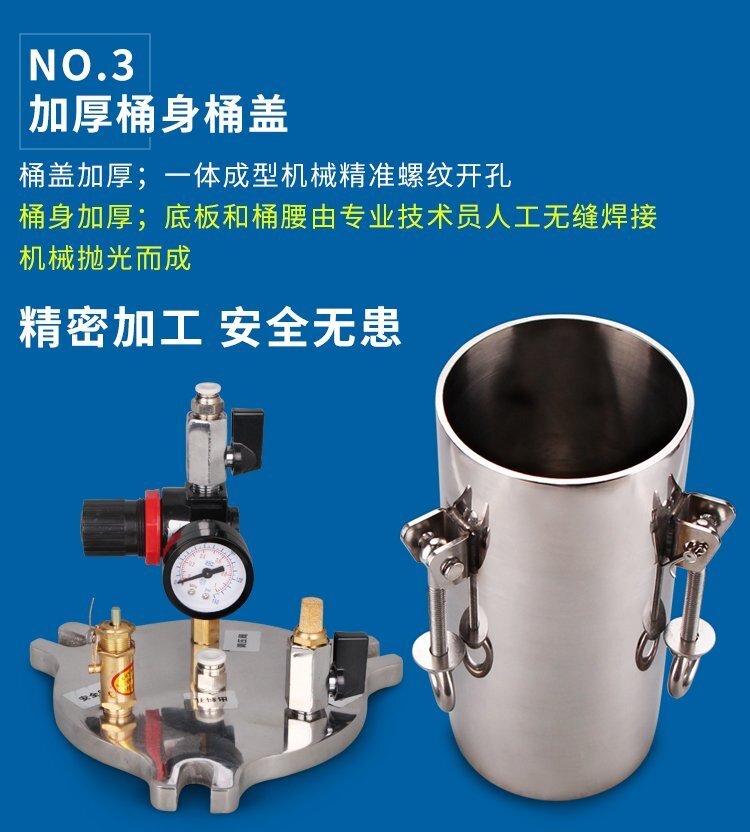 壓力桶使用304優(yōu)質(zhì)不銹鋼材料,耐腐蝕性強(qiáng),加厚的桶壁和桶蓋,安全有保證,在作業(yè)中可以放心使用;可定制添加:漏斗/液位/觀(guān)察鏡/攪拌器/活塞/加熱包等;適合工程/工廠(chǎng)長(zhǎng)期生產(chǎn)使用;有大量現(xiàn)貨供應(yīng),歡迎咨詢(xún)采購(gòu)!